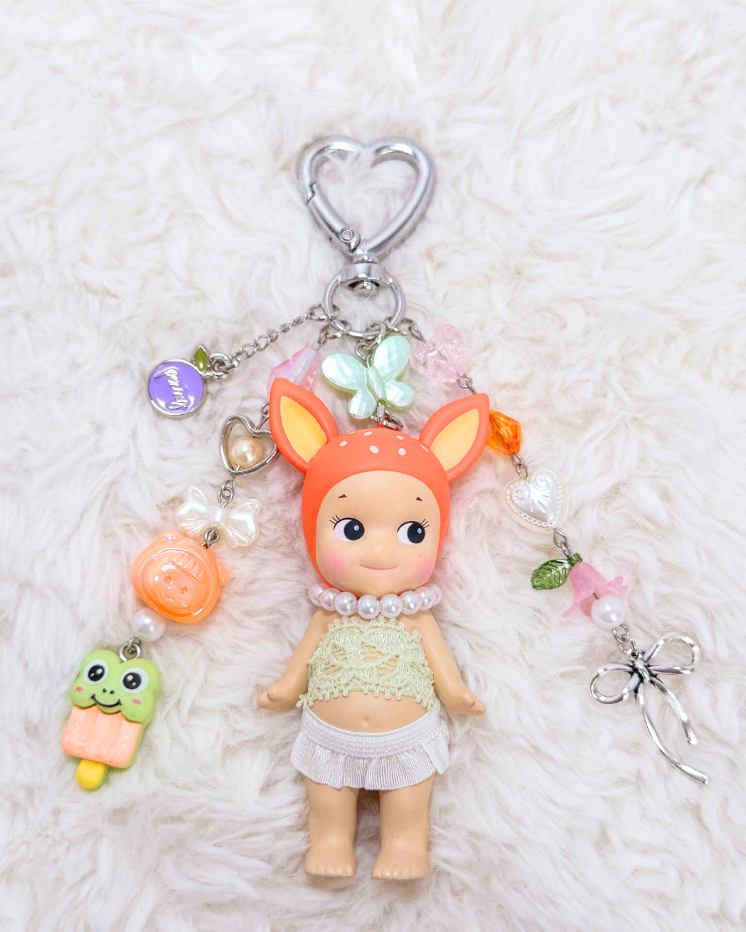 Each charm features an original Sonny Angel doll dressed in a custom handmade outfit, accessorized with dreamy pastel beads, fruits, and bows. These are the cutest charms to clip onto your keys, bags, or simply display as part of your collection! 💖